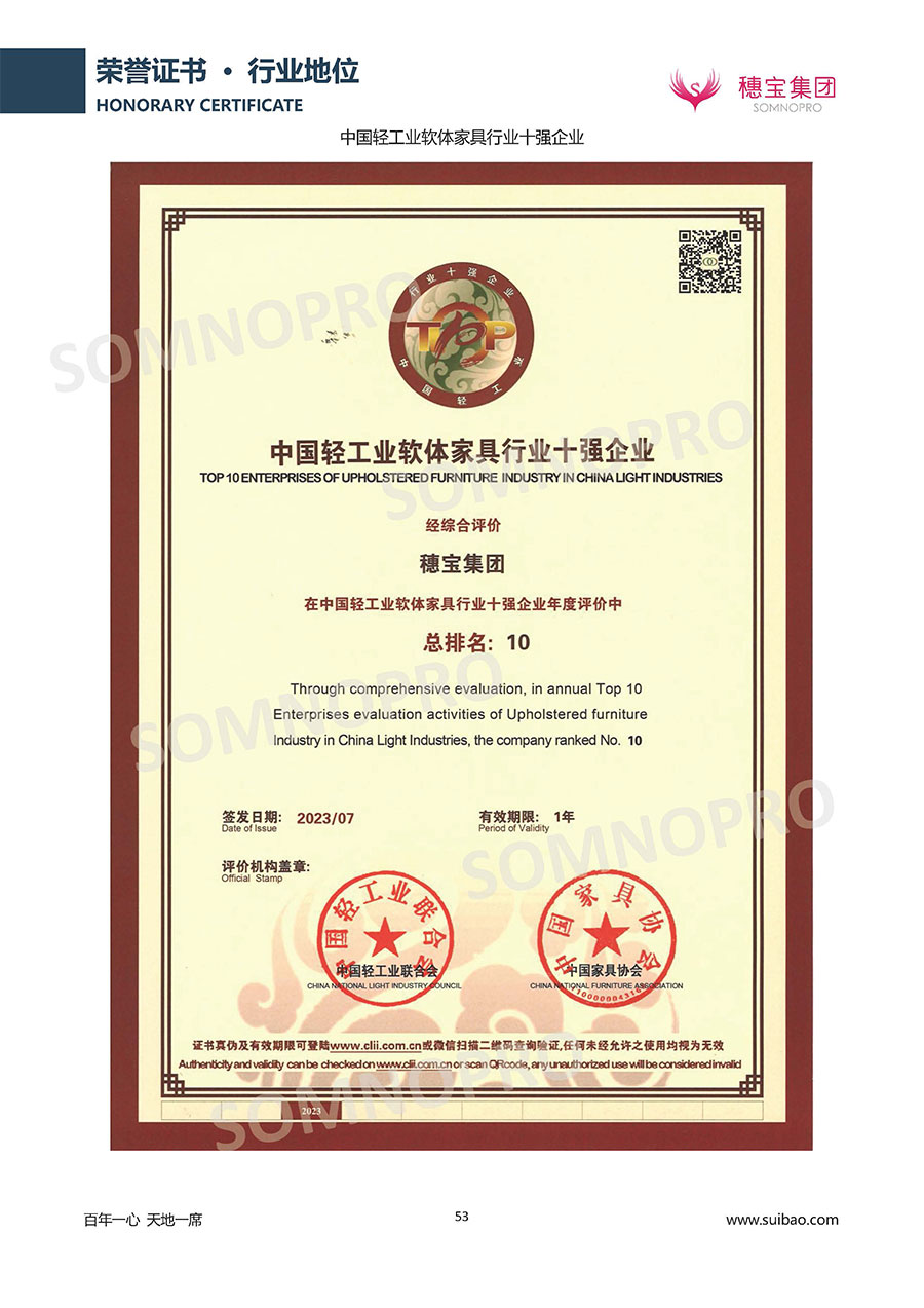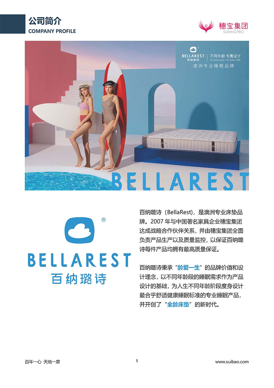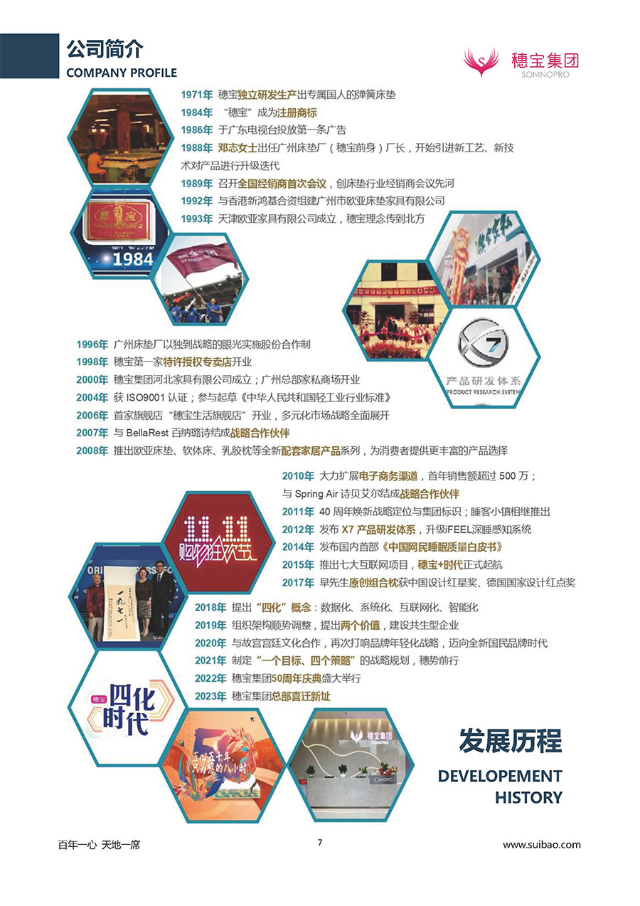 半個(gè)世紀(jì)的付出,穗寶集團(tuán)在深度睡眠領(lǐng)域收獲非凡成就,贏得業(yè)界與社會(huì)的一致贊譽(yù)。作為大家居行業(yè)的品質(zhì)倡導(dǎo)者,穗寶集團(tuán)不斷創(chuàng)新,豐富品牌實(shí)力,致力推動(dòng)中國床墊產(chǎn)業(yè)發(fā)展。至今,穗寶集團(tuán)旗下?lián)碛卸鄠€(gè)來自世界各地的優(yōu)質(zhì)品牌,包括:穗寶、詩貝艾爾、百納璐詩、睡客小鎮(zhèn)、Mr.Z早先生等;此外,穗寶集團(tuán)從世界各地甄選適合不同消費(fèi)者的優(yōu)質(zhì)睡眠產(chǎn)品,定制屬于您的睡眠空間。如今,穗寶集團(tuán)形成以研發(fā)、生產(chǎn)和銷售床墊為主營業(yè)務(wù),涉及家具、家居裝飾、酒店配套等多項(xiàng)業(yè)務(wù)的企業(yè)群體。