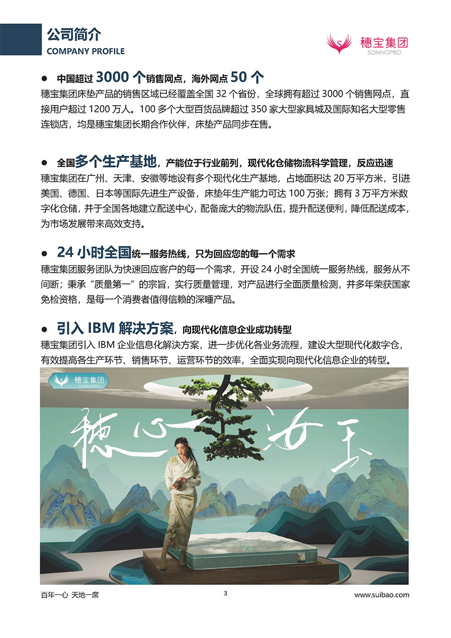 中國超過3000個銷售網點,海外網點50個穗寶集團床墊產品的銷售區(qū)域已經覆蓋全國32個省份,全球擁有超過3000個銷售網點,直接用戶超過1200萬人。100多個大型百貨品牌超過350家大型家具城及國際知名大型零售連鎖店,均是穗寶集團長期合作伙伴,床墊產品同步在售。