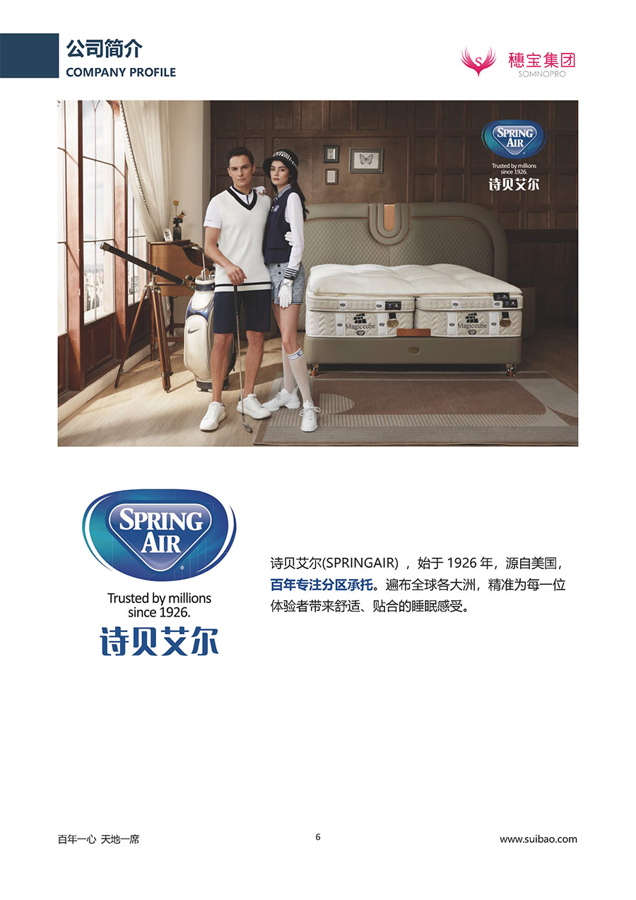 至今,穗寶集團旗下擁有多個來自世界各地的優(yōu)質品牌,包括:穗寶、詩貝艾爾、百納璐詩、睡客小鎮(zhèn)、Mr.Z早先生等;此外,穗寶集團從世界各地甄選適合不同消費者的優(yōu)質睡眠產品,定制屬于您的睡眠空間。如今,穗寶集團形成以研發(fā)、生產和銷售床墊為主營業(yè)務,涉及家具、家居裝飾、酒店配套等多項業(yè)務的企業(yè)群體。