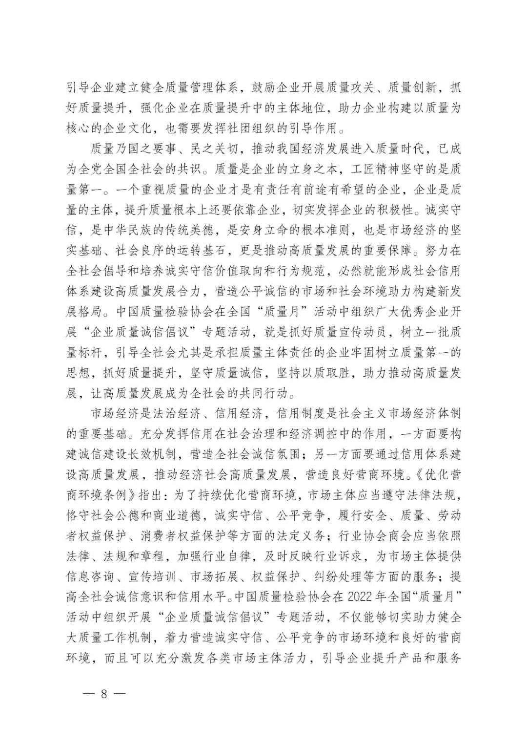 李克強總理批示指出,打造集質(zhì)量、標準、技術(shù)、品牌等于一體的高品質(zhì)產(chǎn)品和服務(wù),在市場競爭中鍛就中國質(zhì)量、培育中國精品。倡導(dǎo)企業(yè)對產(chǎn)品和服務(wù)質(zhì)量作出誠信倡議,也是中國質(zhì)量檢驗協(xié)會自2004年以來組織開展全國“質(zhì)量月”企業(yè)質(zhì)量誠信倡議專題活動的要義。謹期社會各界共同努力,推進質(zhì)量社會共治,抓好產(chǎn)品和服務(wù)的高品質(zhì)質(zhì)量提升,共同為我們的質(zhì)量強國事業(yè)去奮斗!