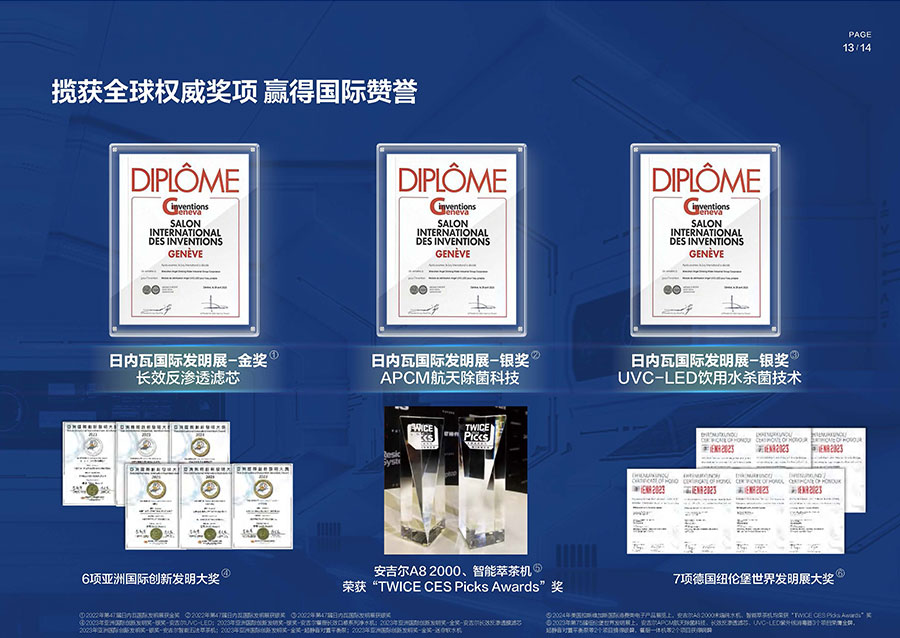 37年來,安吉爾始終堅(jiān)持科技創(chuàng)新,不斷引領(lǐng)行業(yè)技術(shù)升級。參與17項(xiàng)國家及行業(yè)標(biāo)準(zhǔn)制修訂,累計(jì)獲得900余項(xiàng)專利,建立4大水質(zhì)實(shí)驗(yàn)室。2023年,安吉爾憑實(shí)力斬獲全球9項(xiàng)發(fā)明獎,包含3項(xiàng)日內(nèi)瓦國際發(fā)明展獎項(xiàng),6項(xiàng)亞洲創(chuàng)新發(fā)明展獎項(xiàng)。