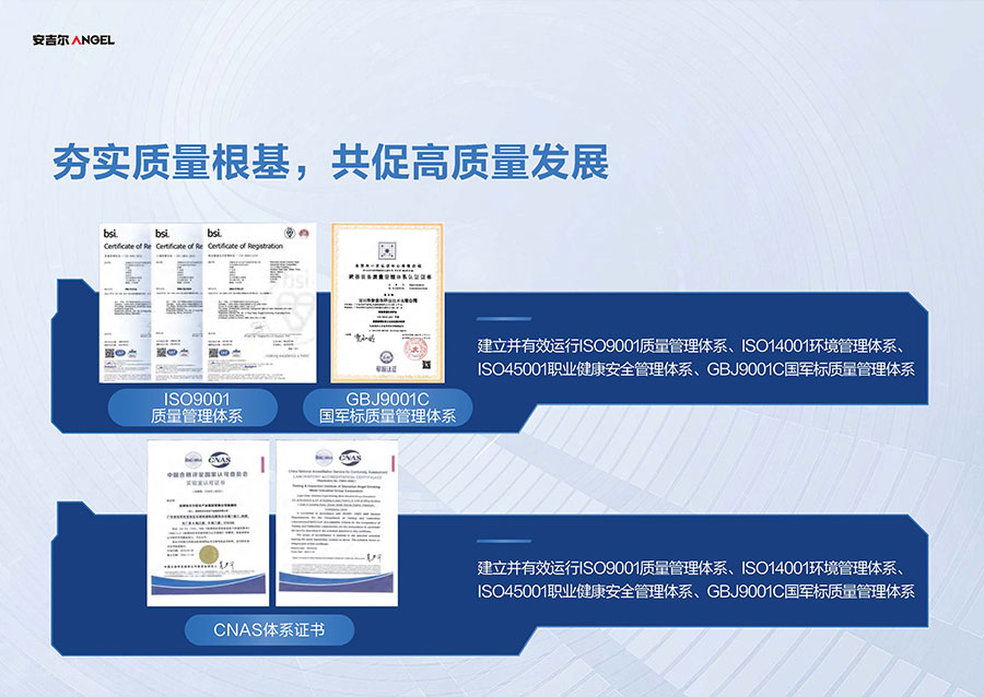 安吉爾擁有三大生產(chǎn)基地,其中安吉爾環(huán)境科技智慧園占地超60萬平方米,可實(shí)現(xiàn)年產(chǎn)1000萬臺(套)的凈飲水產(chǎn)品規(guī)模。安吉爾擁有完整的生產(chǎn)管理體系,已獲中國CQC、美國UL、美國NSF、加拿大CSA、法國BV、英國ITS、瑞士SGS和德國TüV全球八項(xiàng)權(quán)威機(jī)構(gòu)認(rèn)證。