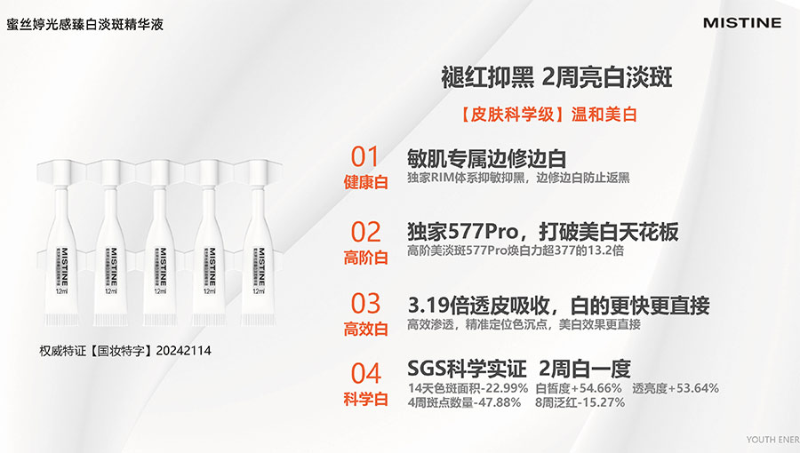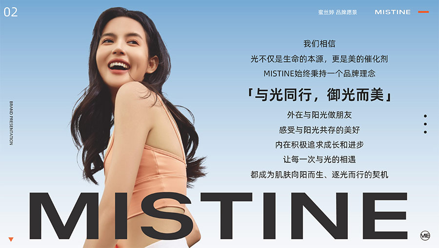 MISTINE蜜絲婷堅持圍繞對“光”的研究,在光與防曬護膚、光與色彩妝容的產(chǎn)品應用層面,研究光、理解光、樂享光,持續(xù)不斷地提供產(chǎn)品解決方案,滿足消費者對防曬美白、潮流妝容、護膚健康的需求。