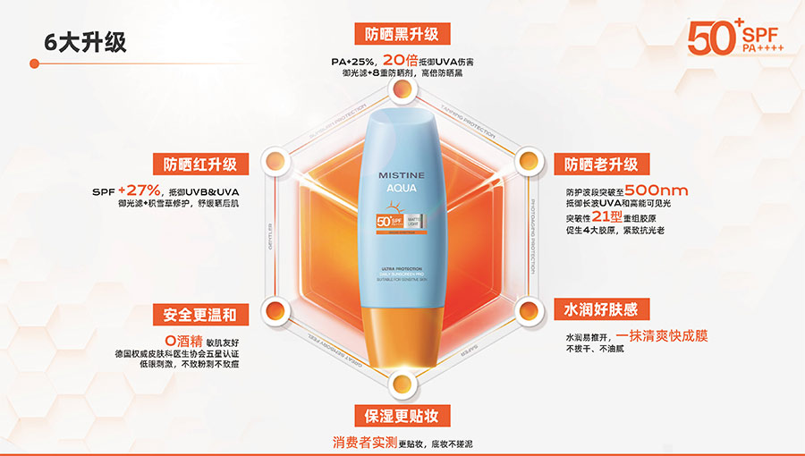 MISTINE蜜絲婷提出皮膚科學、前沿科技、靈魂成分、熱帶美學、卓越功效、保護環(huán)境六大品牌價值,致力于為全球女性提供豐富、安全、高品質(zhì)的美妝產(chǎn)品?;贛ISTINE蜜絲婷品牌首席顧問——全球計算生物學權(quán)威之一、諾貝爾化學獎得主Arieh Warshel的研究,MISTINE創(chuàng)新防曬品類推出「光生物學」防曬系統(tǒng),提出“外層防護、中層修護和底層抗損”防曬新理念,引領(lǐng)防曬從“表面防護”進入“深度抗光老”新時代。同時,MISTINE蜜絲婷還持續(xù)深耕專業(yè)彩妝市場,以熱帶美學基因造就產(chǎn)品防水防汗、高倍耐曬、長效持妝的優(yōu)勢,圍繞消費者需求打造多元化的產(chǎn)品矩陣,引領(lǐng)防曬、底妝賽道發(fā)展。