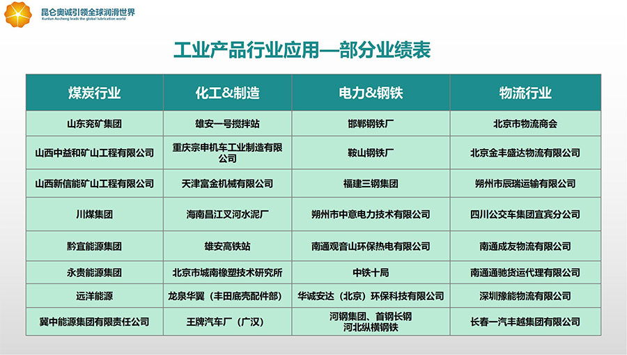 經(jīng)過多年的發(fā)展,昆侖奧誠的品牌影響力不斷擴大,銷量顯著增長,實力不斷增強。昆侖奧誠在全國各地建立了多層銷售網(wǎng)絡,用戶遍布汽車制造、工程機械制造、鋼鐵、礦山綜合采礦設備、熱發(fā)電、工程機械、船舶、紡織機械設備等工業(yè)產(chǎn)品,覆蓋工程機械油、汽車油、工業(yè)油、油脂、特種油等多個石化領域。