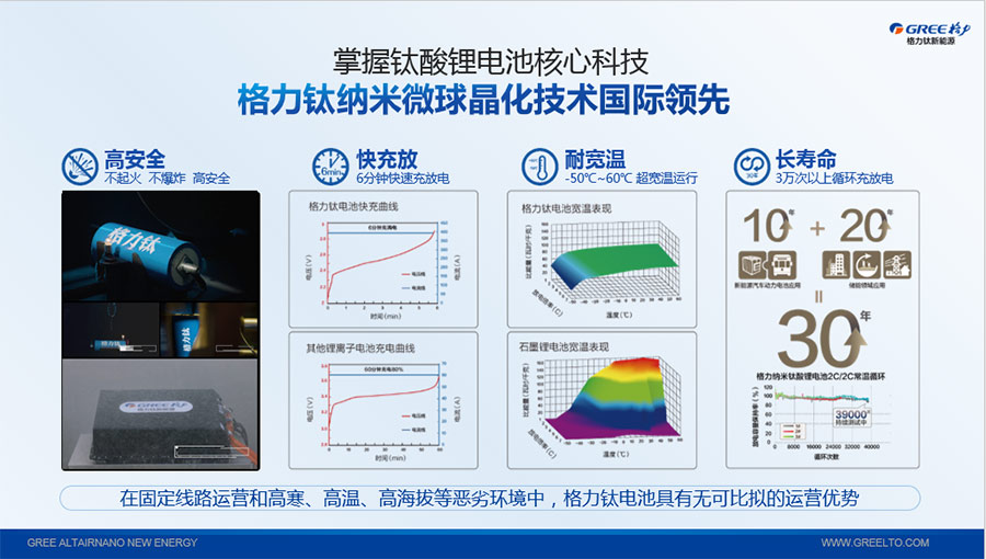 鈦酸鋰電池技術(shù)是新能源行業(yè)唯一獲得中國專利獎金獎的鋰電池產(chǎn)品技術(shù),其應(yīng)用于儲能電池和動力電池具有超高安全性,在快充放、耐寬溫、長壽命等方面同樣具有卓越的性能。格力鈦電池系列產(chǎn)品具有不起火不爆炸高安全、6分鐘快充放、-50℃至60℃耐寬溫特性,循環(huán)充放電次數(shù)高達(dá)30000多次,使用壽命長達(dá)30年。格力鈦電池經(jīng)利鋸切割、尖針穿刺、強(qiáng)力擠壓、電鉆沖孔、短路充放電、高溫加熱、槍擊等極限條件測試,均未發(fā)生冒煙、起火、燃燒、爆炸等現(xiàn)象。