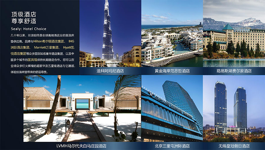 幾十年以來,絲漣始終是全球高端酒店業(yè)的首選床墊供應(yīng)商。品牌與Hilton希爾頓酒店集團(tuán)、IHG洲際酒店集團(tuán)、Marriott萬豪集團(tuán)、Hyatt凱悅酒店集團(tuán)等眾多國際知名奢華酒店集團(tuán),以及中國多個(gè)城市的國賓館保持長期穩(wěn)定合作。您可以在全球眾多燈火輝煌的超豪華及五星級酒店與它邂逅,體驗(yàn)絲漣床墊帶來的舒適尊貴。