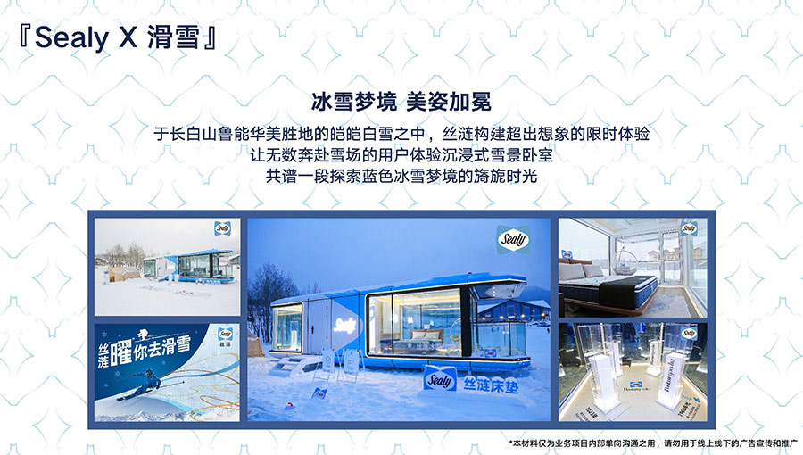 于長白山魯能華美勝地的皚皚白雪之中,絲漣構(gòu)建超出想象的限時(shí)體驗(yàn),讓無數(shù)奔赴雪場的用戶體驗(yàn)沉浸式雪景臥室,共譜一段探索藍(lán)色冰雪夢境的旖旎時(shí)光。