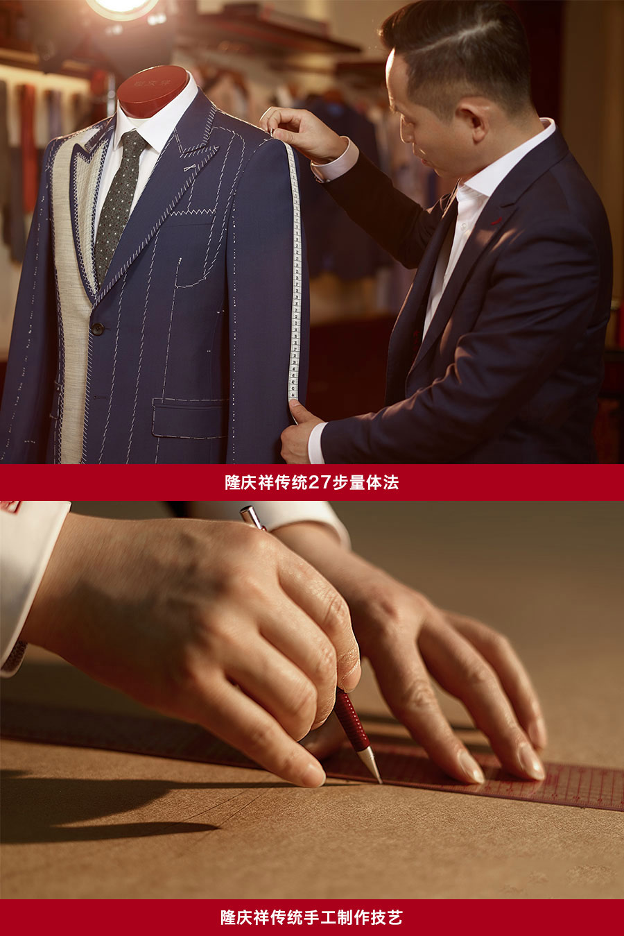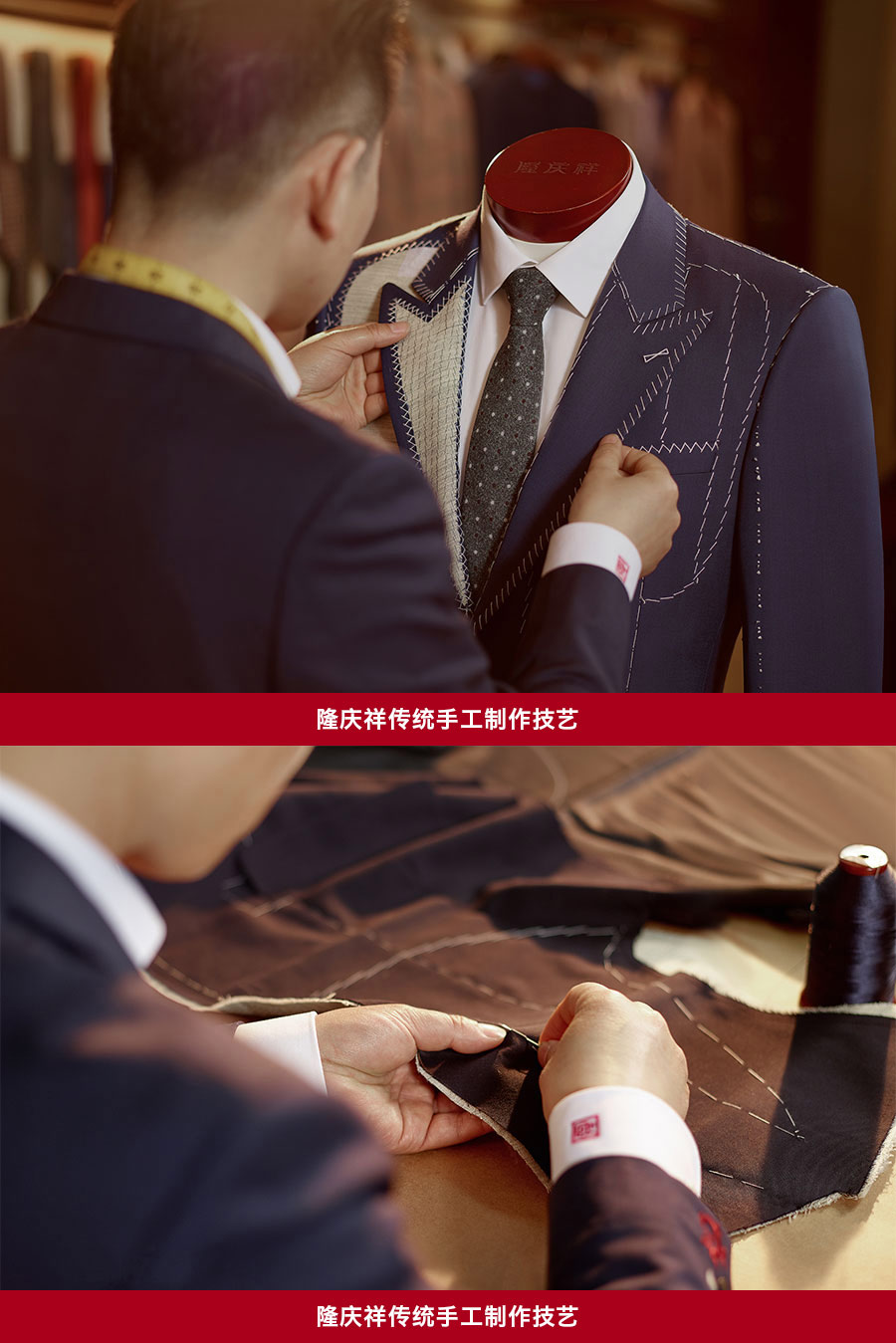 隆慶祥以量身定制為核心特色,提供從面料選擇、款式設計到工藝優(yōu)化、售后服務的全程服務,產品均為“單人單版、單版單裁、單裁單做”,以獨一無二的專屬性彰顯尊貴榮耀。每套西裝定面料、定款式、制版、裁剪、制作、試樣、后道整理、取件共八道工序,均采用406道工序,而且大量工序是手工制作。產品均“單人單版、單版單裁、單裁單做”,以獨一無二的專屬性彰顯尊貴榮耀。