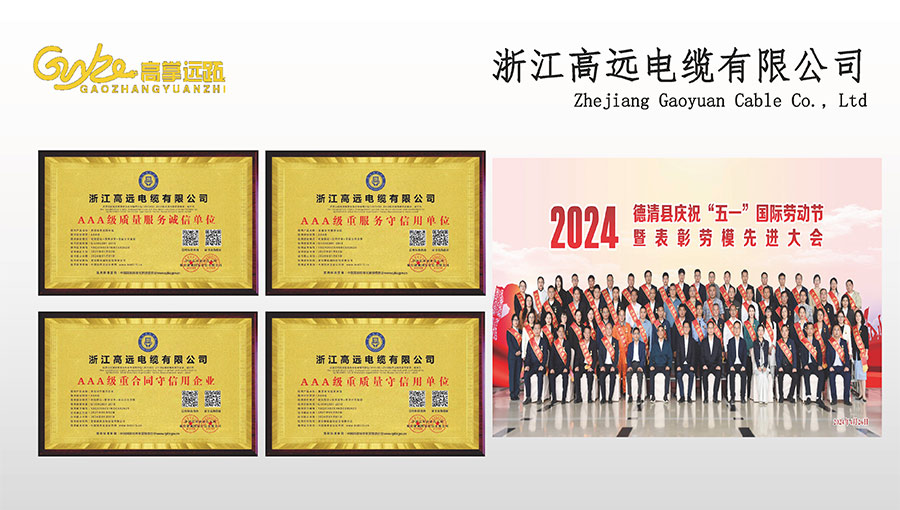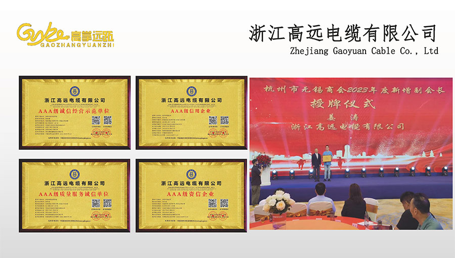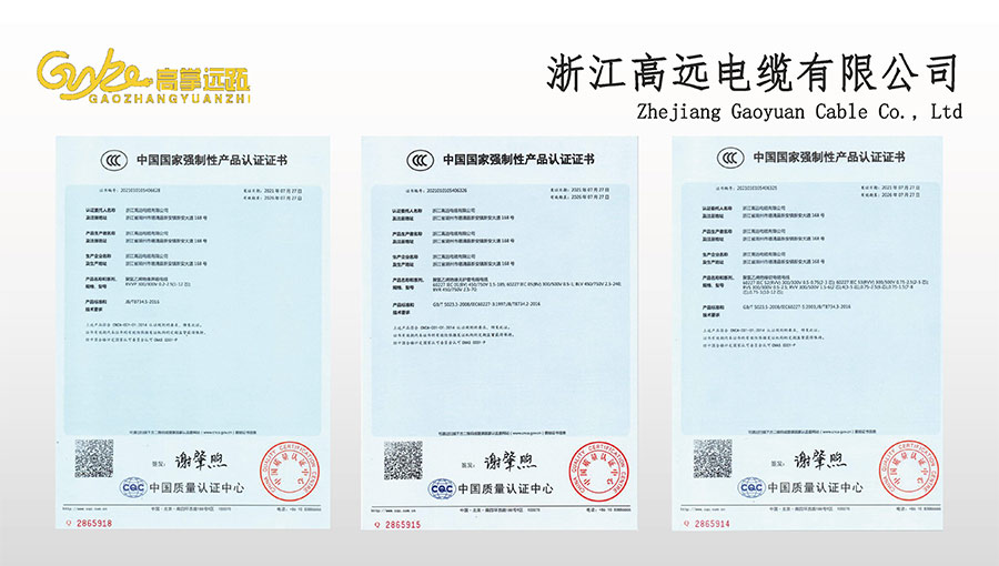 高遠電纜是浙江省電線電纜重點工業(yè)企業(yè),浙江省專精特新企業(yè)、浙江省科技型企業(yè),浙江省標準化良好行為AAA級企業(yè);獲得了國家頒發(fā)的生產(chǎn)許可證,通過了CCC國家強制性產(chǎn)品認證,ISO9001質(zhì)量體系認證,ISO14001環(huán)境體系認證,OHSAS18001職業(yè)健康安全管理體系認證,PCCC產(chǎn)品認證、B1級燃燒性能授權(quán)書;榮獲浙江省著名商標,浙江省重合同守信譽企業(yè),浙江省優(yōu)質(zhì)產(chǎn)品,市級研究開發(fā)中心,清潔工廠,綠色工廠等國家、省、市授權(quán)的榮譽稱號,取得了多項發(fā)明專利、實用型專利。