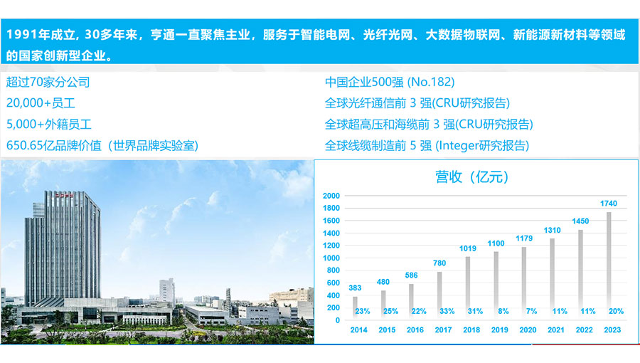 江蘇亨通電力電纜有限公司是亨通集團(tuán)旗下的一家國(guó)家級(jí)重點(diǎn)高新技術(shù)企業(yè),注冊(cè)商標(biāo)“亨通光電”,注冊(cè)資金185168萬(wàn)元,成立于1995年,目前員工總數(shù)為一千余人。可以研發(fā)制造220kV及以下交聯(lián)電力電纜、防火電纜、光纖復(fù)合電纜、光伏電纜、鋁合金電纜、電氣裝備電纜、控制電纜、低壓電線等產(chǎn)品,可滿足電力、通信、交通、冶金、石油石化、煤炭、船舶、軍工等不同行業(yè)、地區(qū)和國(guó)家客戶的差異化需求。