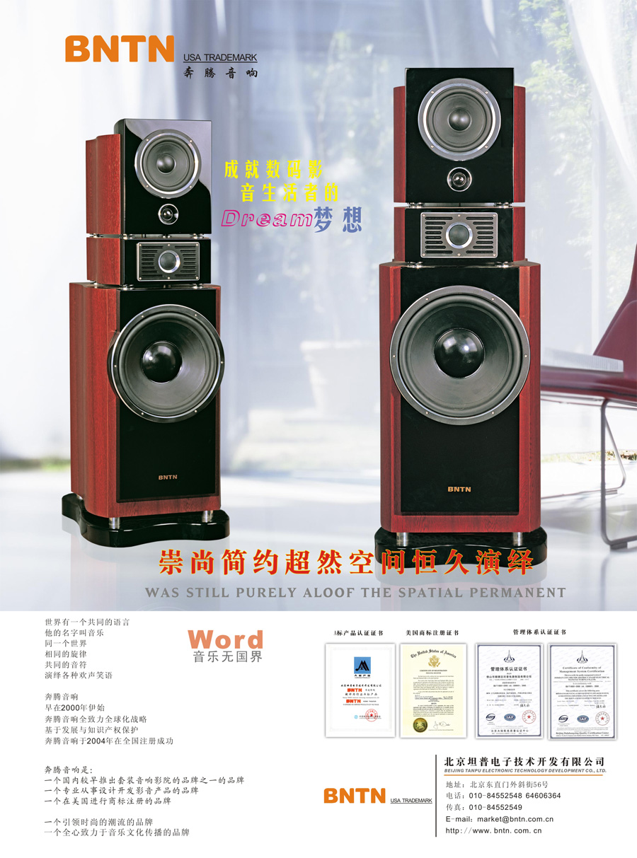 北京坦普電子技術(shù)開(kāi)發(fā)有限公司是一家專(zhuān)業(yè)從事家庭影院設(shè)計(jì)、開(kāi)發(fā)、銷(xiāo)售的公司,其主打品牌BNTN奔騰音響(中國(guó)中文注冊(cè)“萬(wàn)馬奔騰”)是國(guó)內(nèi)較早推出套裝音響影院的品牌之一。