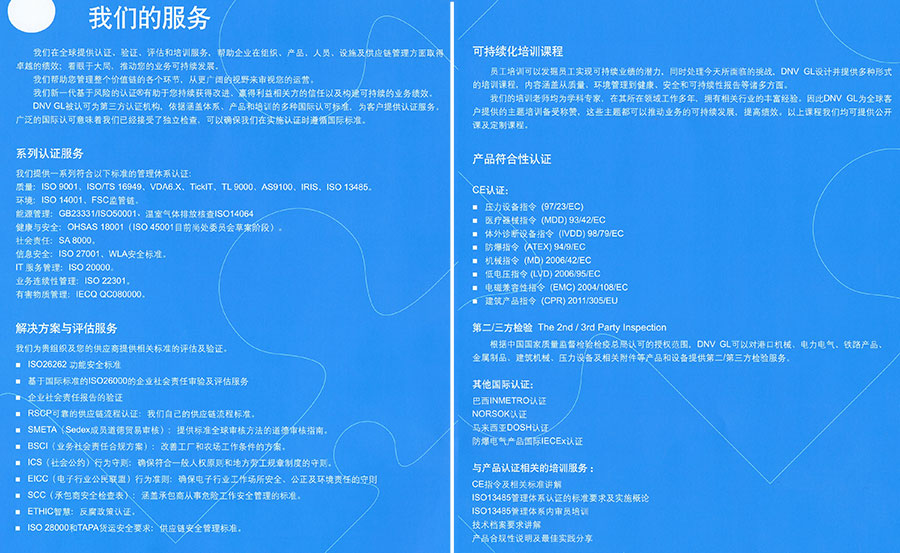 作為一家世界領(lǐng)先的提供管理服務(wù)的國(guó)際機(jī)構(gòu),DNV GL通過(guò)為客戶(hù)提供認(rèn)證、驗(yàn)證、評(píng)估和培訓(xùn)服務(wù),確??蛻?hù)在組織、產(chǎn)品、人員、設(shè)施以及供應(yīng)鏈管理方面取得卓越的業(yè)績(jī)。我們始終與客戶(hù)通力合作,幫助客戶(hù)構(gòu)建一個(gè)業(yè)務(wù)可持續(xù)發(fā)展的平臺(tái),并贏得利益相關(guān)方的信任。
