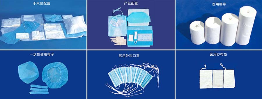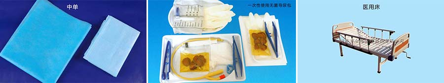 主要產(chǎn)品:金環(huán)騰月無(wú)菌產(chǎn)包、手術(shù)包、導(dǎo)尿包、換藥包、紗布?jí)K、無(wú)菌醫(yī)用墊等