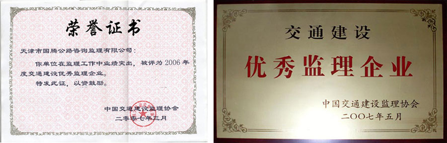 自1998年起,先后有津榆公路蘆臺(tái)大橋、東方紅路跨京福高速公路立交橋、北華路、朝陽道、邦喜、津漢、薊官、潘青、津薊高速公路、寶平公路大修、躍進(jìn)路、大陳路等37項(xiàng)大修改建監(jiān)理工程被評(píng)為天津市政公路工程質(zhì)量金獎(jiǎng);公司承擔(dān)的江西贛定高速公路、陜西延塞高速公路、黃陵高速公路、浙江龍游高速公路、內(nèi)蒙古哈磴高速公路、京滬高速公路等外埠監(jiān)理項(xiàng)目多次受到業(yè)主和當(dāng)?shù)卣募为?jiǎng)。目前,京津高速公路、津汕高速公路、國道112線、京津高速延長線、海濱高速公路、內(nèi)蒙呼市繞城高速公路、江西萍洪高速公路、山西晉候高速公路機(jī)電工程和市內(nèi)27項(xiàng)獨(dú)立項(xiàng)目均為在監(jiān)工程。