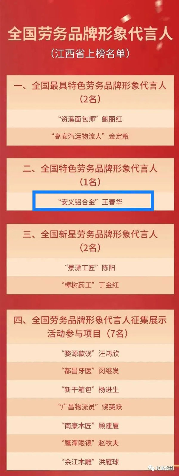 江西省虹鑫鋁業(yè)有限公司董事長(zhǎng)王春華榮獲全國(guó)勞務(wù)品牌安義鋁合金形象代言人稱(chēng)號(hào)