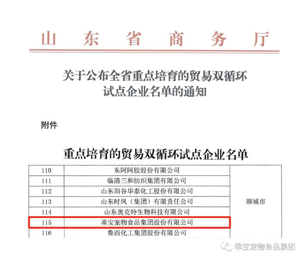 乖寶入選山東省重點(diǎn)培育的貿(mào)易雙循環(huán)試點(diǎn)企業(yè)
