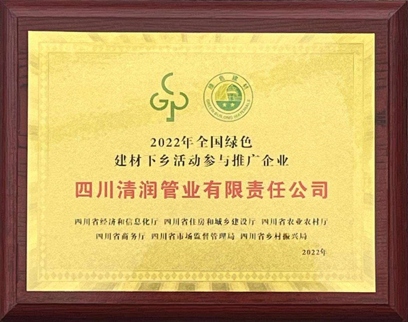 “清潤”自成立以來,便以“打造安全的城市地下生命線”為己任,先后為農(nóng)飲工程、四川大學、西南民族大學、第31屆世界大學生夏季運動會場館等項目供應了一系列的優(yōu)質給水管材管件產(chǎn)品,得到了市場廣大客戶和社會各界的一致肯定。公司先后獲得了“四川名牌”、成都市市級守合同重信用企業(yè)稱號,入選《全國農(nóng)村飲水安全工程材料設備產(chǎn)品信息年報》、《成都市地方產(chǎn)品配套目錄》,信用等級AA級,成為中國塑料加工工業(yè)協(xié)會塑料管道專業(yè)委員會理事單位、中國工業(yè)防腐蝕技術協(xié)會、四川燃氣協(xié)會等協(xié)會會員單位。2022年,在全國綠色建材產(chǎn)品四川站啟動會上,四川清潤管業(yè)還作為優(yōu)秀代表企業(yè)獲得授牌。