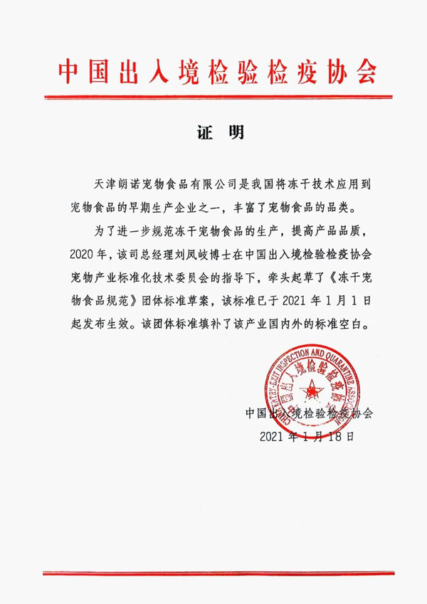 朗諾作為國內(nèi)率先將國際前沿凍干技術(shù)應(yīng)用于寵物食品研發(fā)及生產(chǎn)的企業(yè),始終以推動(dòng)凍干寵物食品行業(yè)規(guī)范、引領(lǐng)產(chǎn)業(yè)升級(jí)為己任。早在2021年1月在寵工委的指導(dǎo)下,由朗諾領(lǐng)銜起草制定《凍干寵物食品規(guī)范》正式頒布實(shí)施,為中國凍干寵物食品樹立細(xì)分行業(yè)標(biāo)準(zhǔn)。