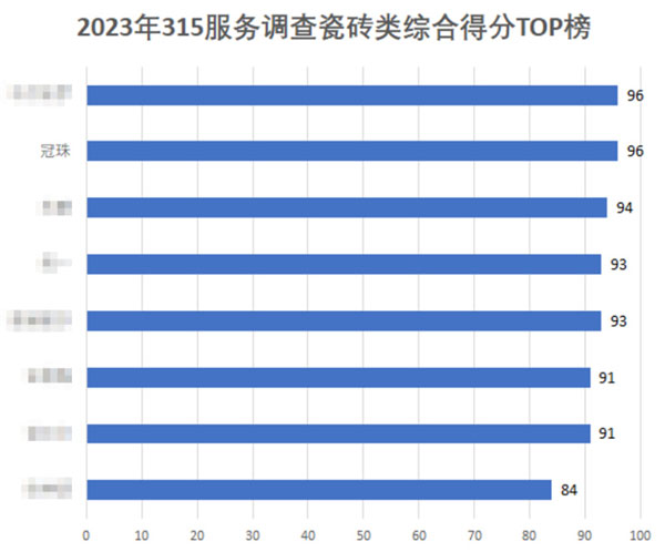 在2023年的315家居服務(wù)摸底中,共計(jì)調(diào)查了22家瓷磚品牌,綜合平均分達(dá)80.55分。其中,冠珠瓷磚以96分的成績高居第一位,再度蟬聯(lián)“年度家居行業(yè)服務(wù)榜樣”獎(jiǎng)項(xiàng)。