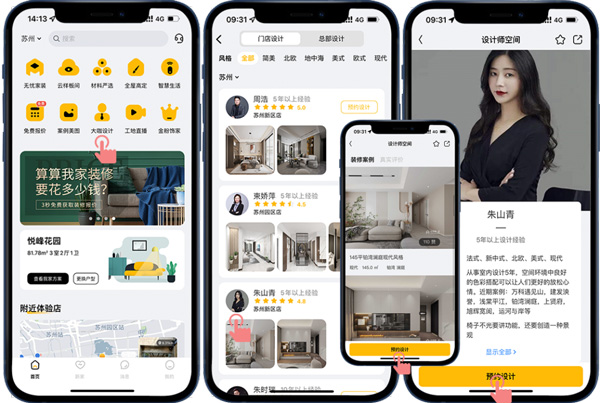 打開金螳螂家APP,進(jìn)入首頁“大咖設(shè)計(jì)”,可了解設(shè)計(jì)師的個人簡介,以及他的優(yōu)秀裝修作品和客戶的真實(shí)評價,通過以上了解,客戶挑選中意的設(shè)計(jì)師,馬上預(yù)約,就可與他線上直接暢聊溝通設(shè)計(jì)方案、設(shè)計(jì)細(xì)節(jié),為客戶量身定制專屬方案。