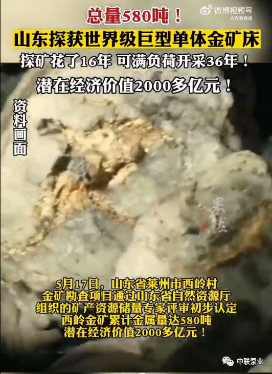 山東萊州市西嶺村金礦勘查項(xiàng)目通過(guò)省自然資源廳組織的儲(chǔ)量專家評(píng)審,初步認(rèn)定西嶺金礦新增金金屬量近200噸,累計(jì)金金屬量達(dá)580噸,潛在經(jīng)濟(jì)價(jià)值2000多億元,是迄今為止國(guó)內(nèi)發(fā)現(xiàn)的最大單體金礦床。