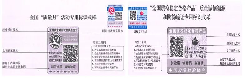 【全國“質(zhì)量月”活動專用標(biāo)識】具有專屬的知識產(chǎn)權(quán)(經(jīng)中國版權(quán)保護中心審核,國家版權(quán)局于2015年7月16日對全國“質(zhì)量月”活動專用標(biāo)識頒發(fā)了《作品登記證書》,登記號:國作登字-2015-L-00188457),基本規(guī)格為5cm2,集電話電碼防偽查詢、二維碼在線掃描、微信驗證、網(wǎng)站查詢等多種功能于一體,綜合運用了紐索幣紋、微縮文字、熒光激發(fā)油墨等多種防偽技術(shù);專用標(biāo)識加貼在企業(yè)產(chǎn)品或包裝上,消費者(用戶)只需要用座機或手機電話撥打全國范圍內(nèi)均不需要加區(qū)號的特服號碼95105365或使用手機掃描二維碼或登陸網(wǎng)站(http://www.12365114.cn)就可直接查詢驗證加貼專用標(biāo)識的產(chǎn)品為第三方質(zhì)量專業(yè)機構(gòu)權(quán)威證明的全國質(zhì)量誠信優(yōu)秀典型企業(yè)生產(chǎn)(銷售)的質(zhì)量誠信安全可靠好產(chǎn)品,形成企業(yè)自己獨有的比較優(yōu)勢。