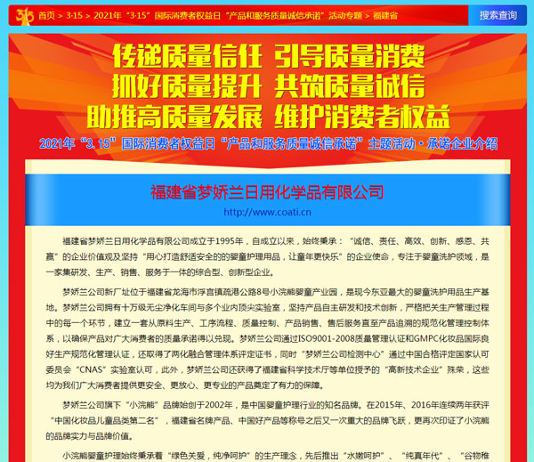 引導(dǎo)質(zhì)量消費(fèi),共筑質(zhì)量誠信,3月15日,由中國質(zhì)量檢驗協(xié)會主辦的2021年“3.15”產(chǎn)品和服務(wù)質(zhì)量誠信承諾的主題活動如期舉行,小浣熊作為“3.15”產(chǎn)品和服務(wù)質(zhì)量誠信承諾企業(yè),憑借匠心的品質(zhì)、優(yōu)質(zhì)的服務(wù)及良好的口碑,獲得協(xié)會以及權(quán)威專家的一致認(rèn)可,榮獲“全國產(chǎn)品和服務(wù)質(zhì)量誠信示范企業(yè)”,“全國質(zhì)量誠信先進(jìn)企業(yè)”、“全國質(zhì)量信譽(yù)保障產(chǎn)品”、“全國日化行業(yè)質(zhì)量領(lǐng)先品牌” 等多項榮譽(yù),《中國質(zhì)量報》、《中國消費(fèi)者報》及中國質(zhì)量網(wǎng)、中國經(jīng)濟(jì)網(wǎng)、中國消費(fèi)網(wǎng)等多家媒體均予以集中展示和公告。