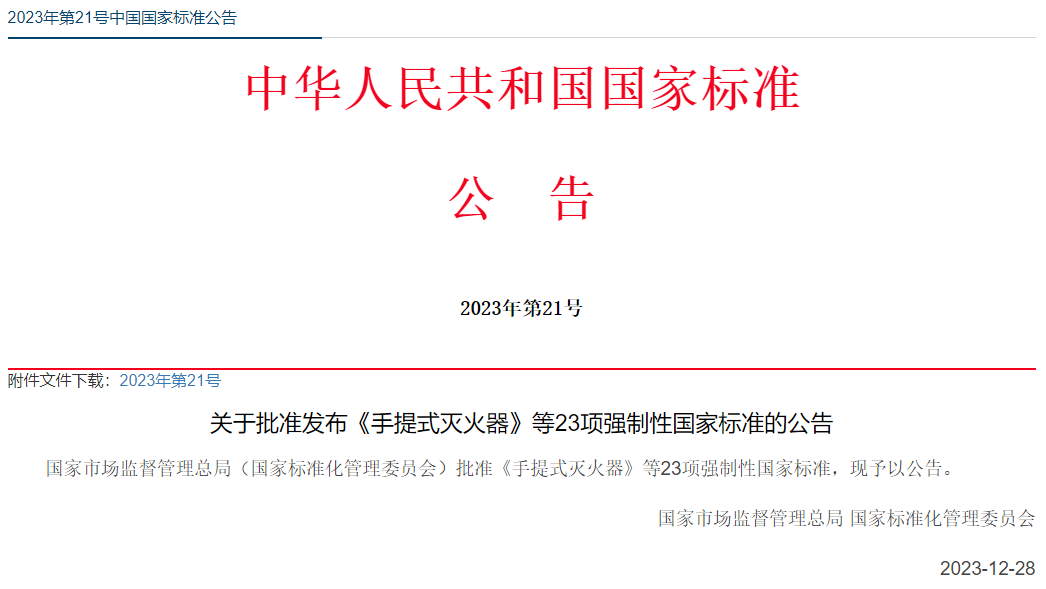 近日,2023年第21號國家標準公告發(fā)布,國家市場監(jiān)督管理總局(國家標準化管理委員會)批準發(fā)布《手提式滅火器》等23項強制性國家標準,詳情如下: