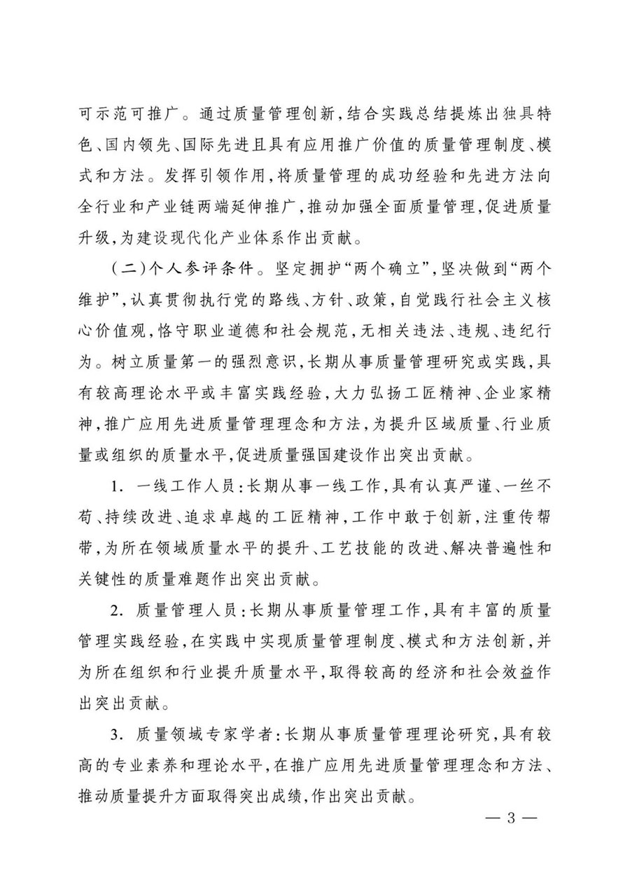 (二)參評個人范圍。包括各行業(yè)領域一線工作人員,各類組織質(zhì)量管理人員,質(zhì)量領域?qū)<覍W者等。