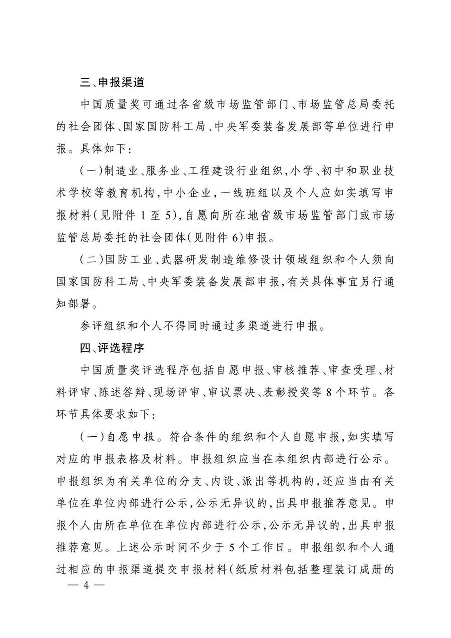 (三)審查受理。對申報材料進行形式審查,并征求有關主管部門意見后,形成中國質(zhì)量獎受理名單,向社會公示。形式審查和征求意見過程中需要參評組織或個人進一步補充資料或就有關情況作出說明的,參評組織或個人應在規(guī)定時間內(nèi)提供相關材料。對未通過審查和公示的申報組織及個人,退回申報材料并說明理由。