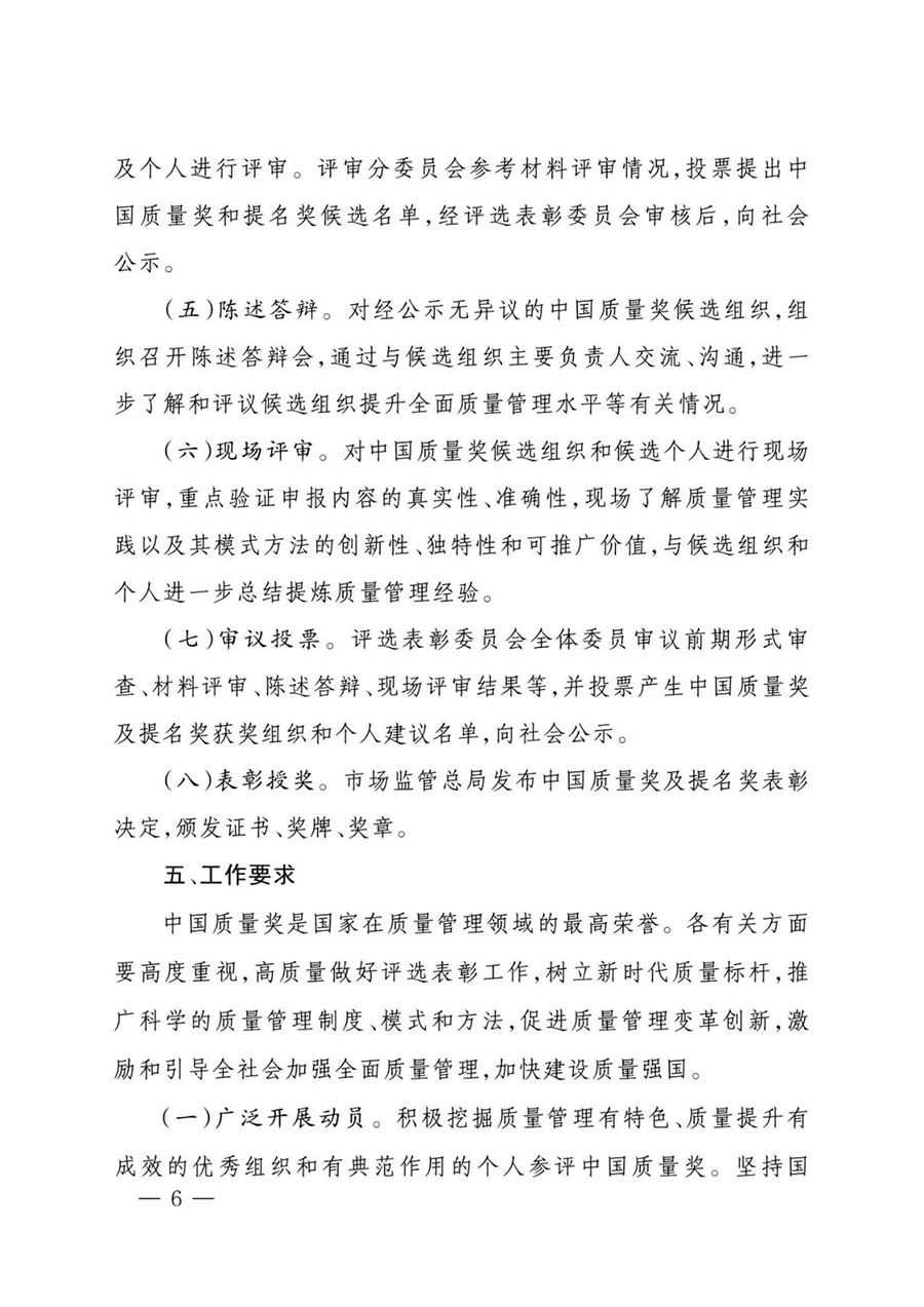 (四)材料評審。按照評審規(guī)則對通過形式審查和公示的組織及個人進行評審。評審分委員會參考材料評審情況,投票提出中國質(zhì)量獎和提名獎候選名單,經(jīng)評選表彰委員會審核后,向社會公示。