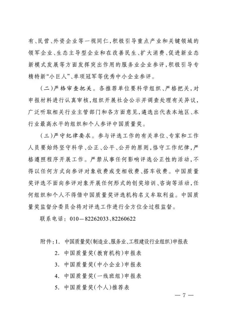 (二)嚴格審查把關。各推薦單位要科學組織、嚴格把關,對申報材料進行認真審核,組織開展社會公示并調(diào)查處理有關異議,廣泛聽取相關行業(yè)主管部門和各方面意見,遴選出代表本地區(qū)、本行業(yè)最高水平的組織和個人參評中國質(zhì)量獎。