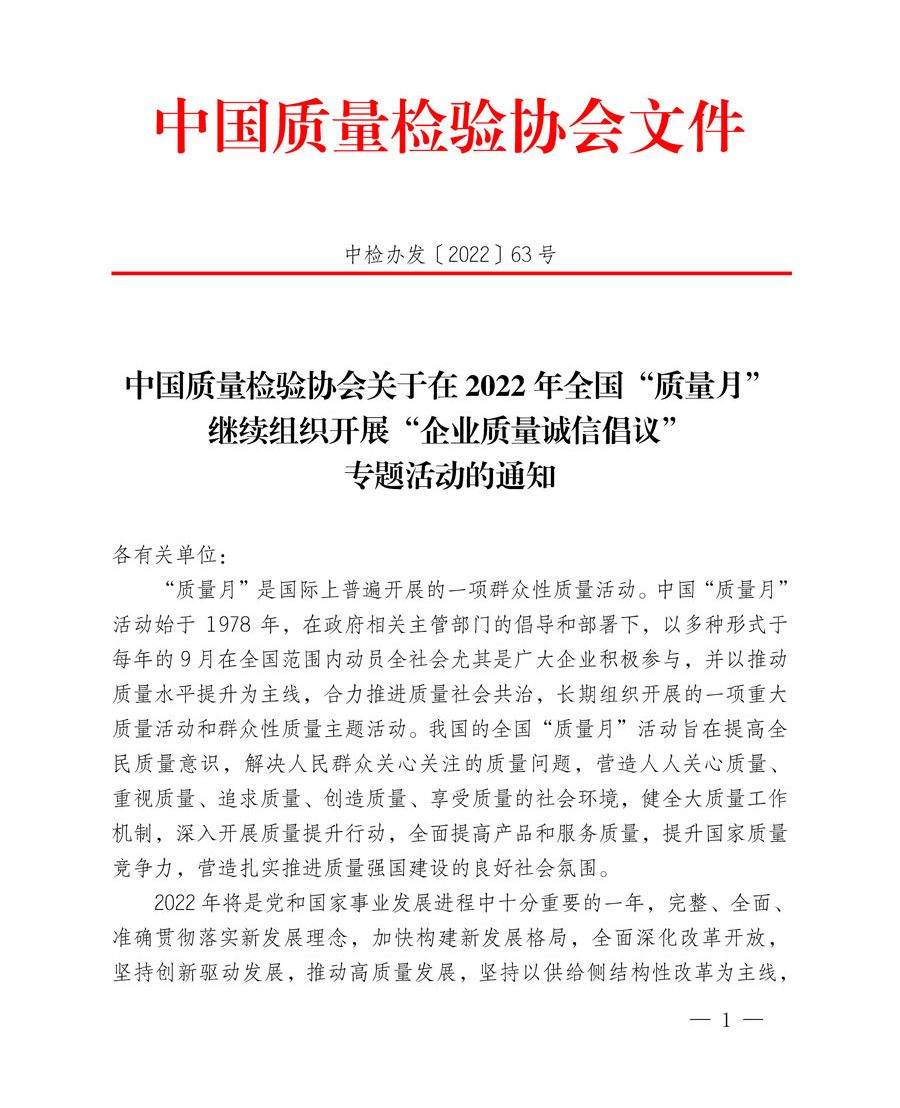 中國(guó)質(zhì)量檢驗(yàn)協(xié)會(huì)作為我國(guó)質(zhì)量檢驗(yàn)行業(yè)組織和質(zhì)量專業(yè)社團(tuán)機(jī)構(gòu),積極響應(yīng)2022年全國(guó)“質(zhì)量月”活動(dòng)部署,充分發(fā)揮推動(dòng)全社會(huì)質(zhì)量共治的橋梁紐帶作用,謹(jǐn)此組織各行各業(yè)在質(zhì)量發(fā)展、質(zhì)量提升、質(zhì)量變革、質(zhì)量創(chuàng)新、質(zhì)量誠(chéng)信等方面具有良好示范作用的2000家優(yōu)秀企業(yè)共同發(fā)出《2022年全國(guó)“質(zhì)量月”企業(yè)質(zhì)量誠(chéng)信倡議書(shū)》,全面樹(shù)立質(zhì)量標(biāo)桿,動(dòng)員廣大企業(yè)開(kāi)展群眾性質(zhì)量活動(dòng),大力弘揚(yáng)社會(huì)主義核心價(jià)值觀,推動(dòng)形成崇尚誠(chéng)信、踐行誠(chéng)信的良好風(fēng)尚,營(yíng)造質(zhì)量誠(chéng)信社會(huì)氛圍,在全社會(huì)掀起建設(shè)質(zhì)量強(qiáng)國(guó)的熱潮。