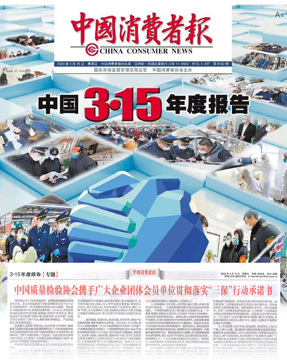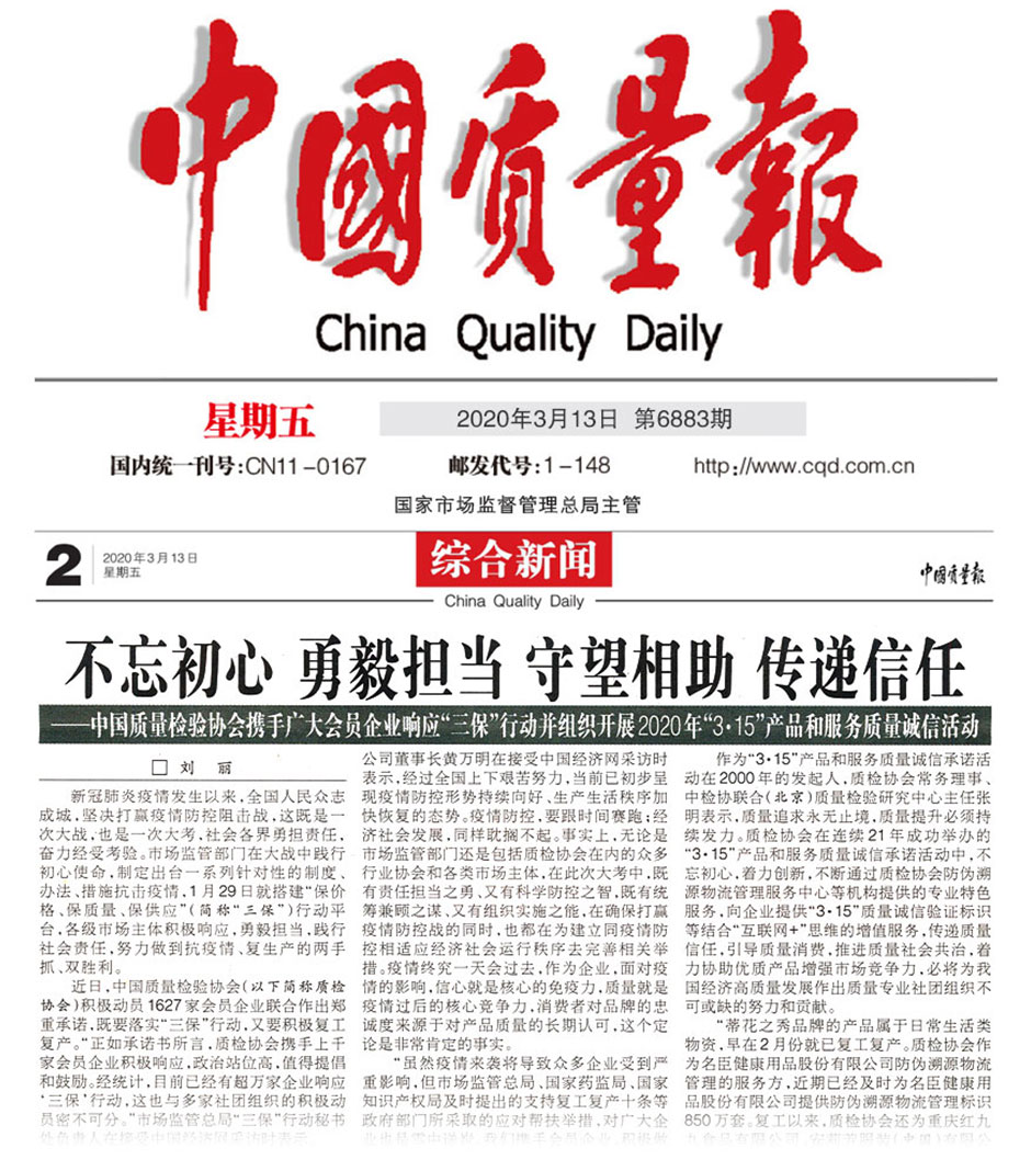 中國質(zhì)量報《不忘初心 勇毅擔(dān)當(dāng) 守望相助 傳遞信任——中國質(zhì)量檢驗(yàn)協(xié)會攜手廣大會員企業(yè)響應(yīng)“三保”行動并組織開展2020年“3·15”產(chǎn)品和服務(wù)質(zhì)量誠信活動》