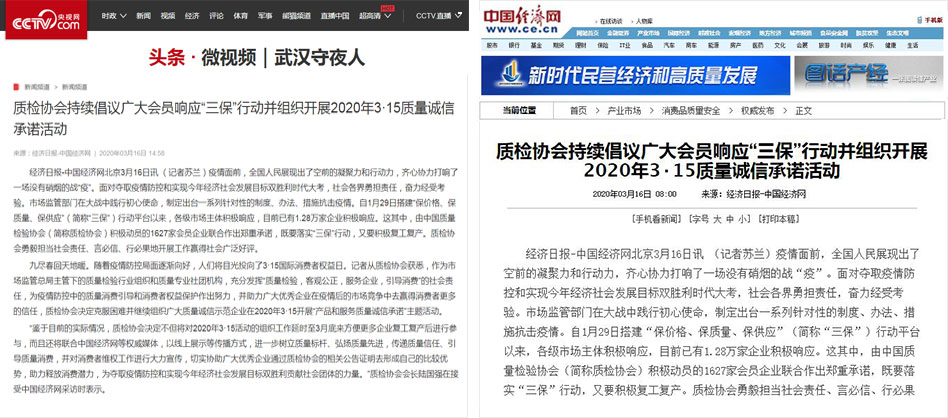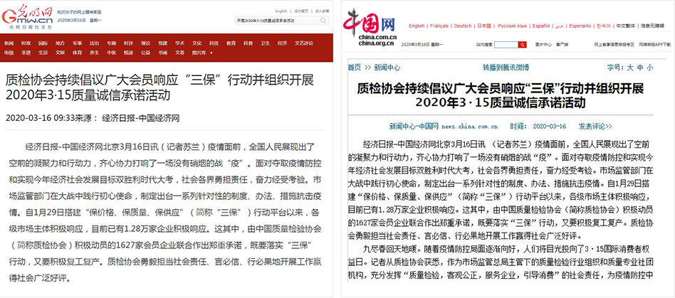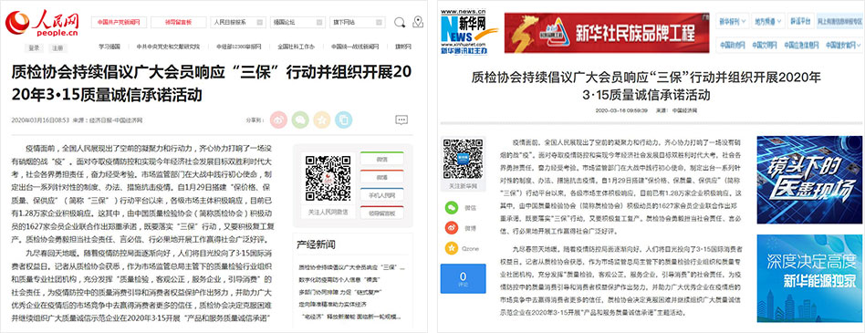 人民網(wǎng)《質(zhì)檢協(xié)會持續(xù)倡議廣大會員響應(yīng)“三保”行動并組織開展2020年3·15質(zhì)量誠信承諾活動》