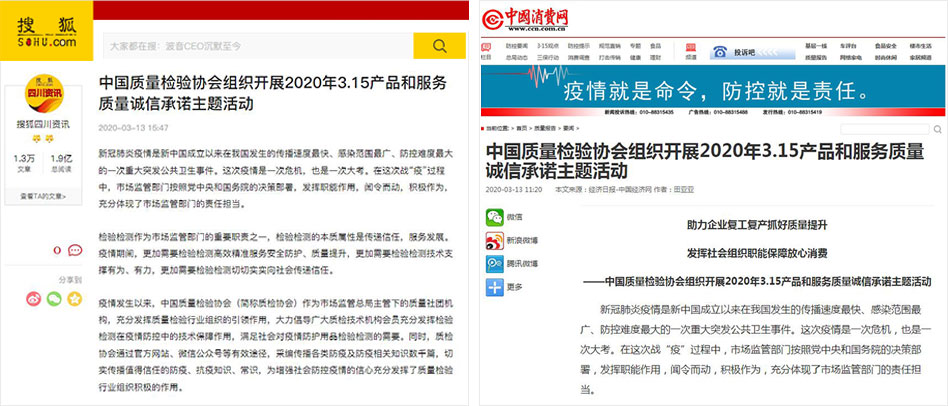 搜狐網(wǎng)《中國質(zhì)量檢驗(yàn)協(xié)會組織開展2020年3.15產(chǎn)品和服務(wù)質(zhì)量誠信承諾主題活動》