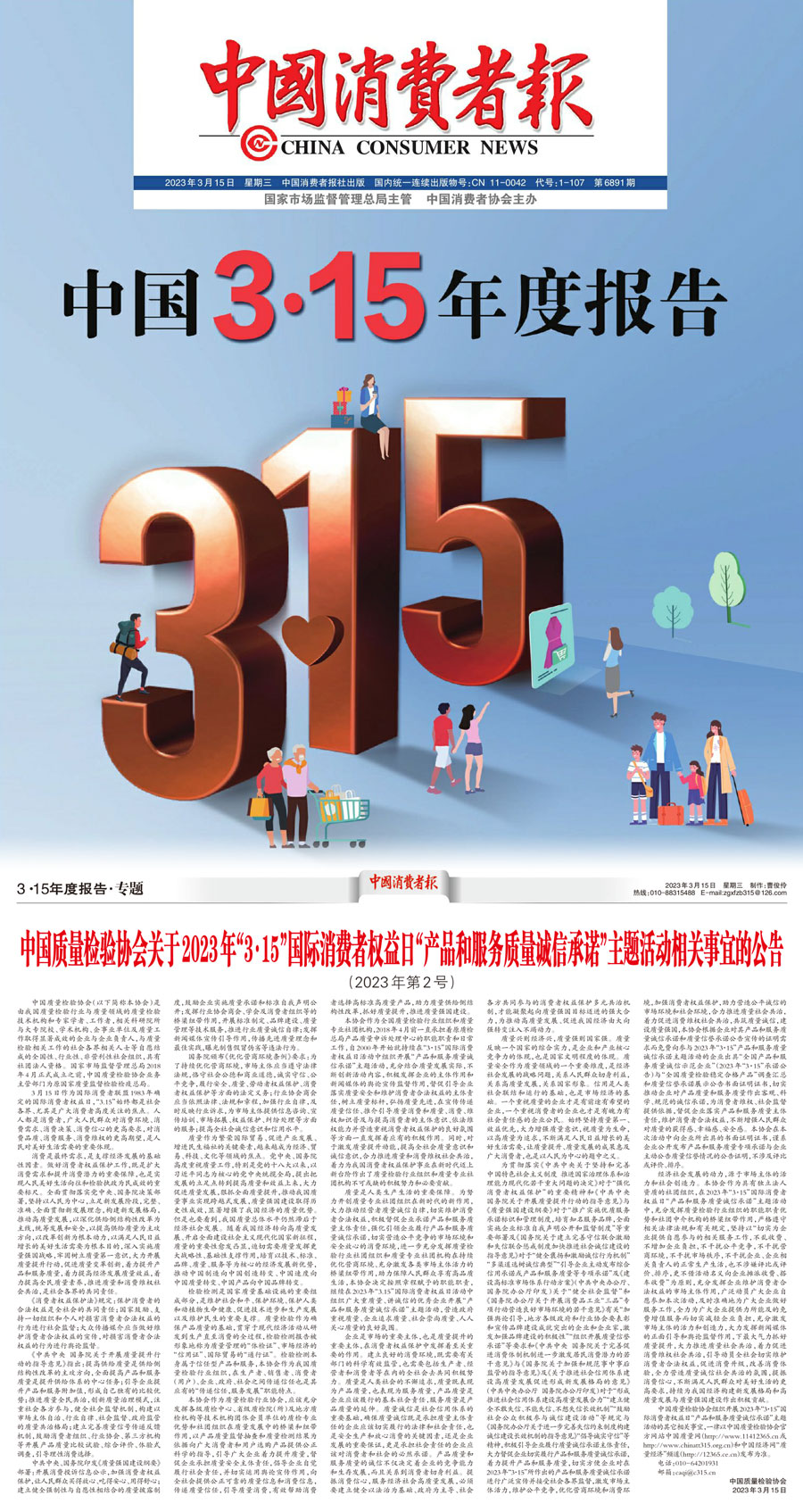 中國消費者報:中國質量檢驗協(xié)會關于2023年“3·15”國際消費者權益日“產(chǎn)品和服務質量誠信承諾”主題活動相關事宜的公告