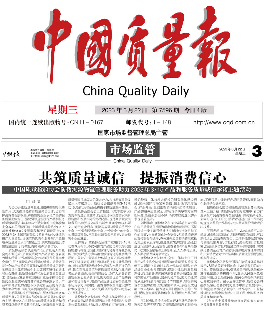 中國質量報:共筑質量誠信 提振消費信心——中國質量檢驗協(xié)會防偽溯源物流管理服務助力2023年3·15產(chǎn)品和服務質量誠信承諾主題活動