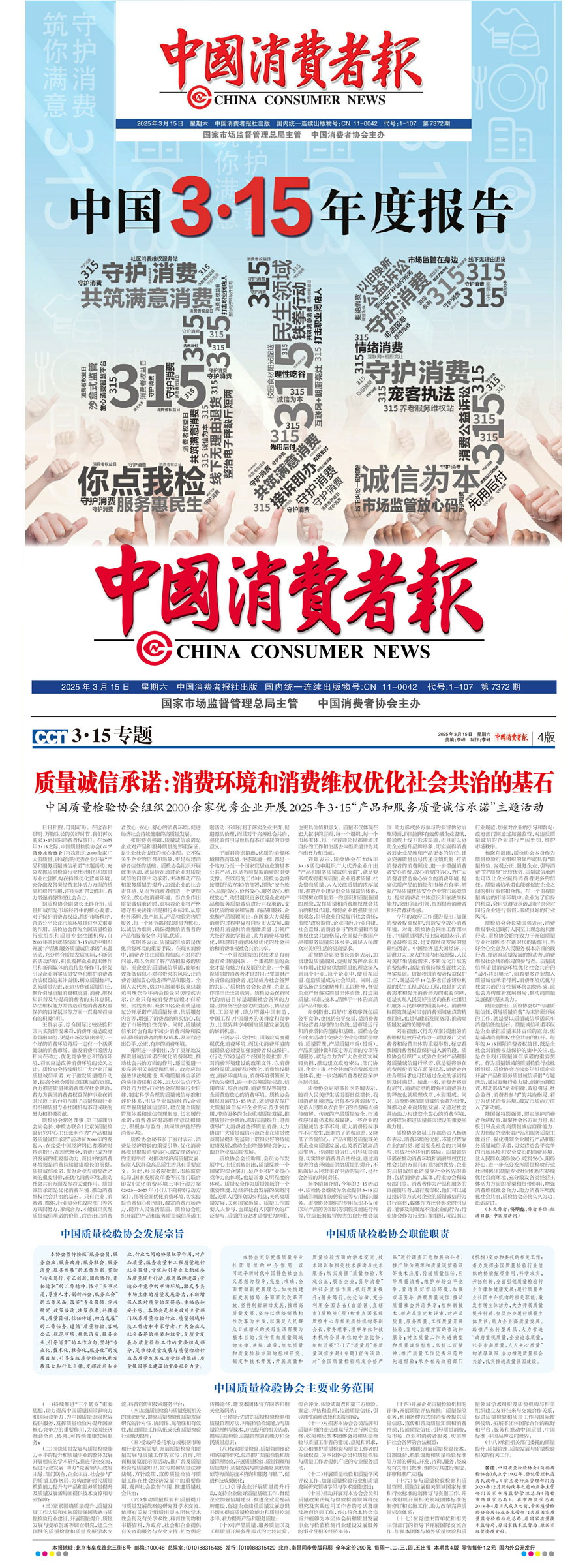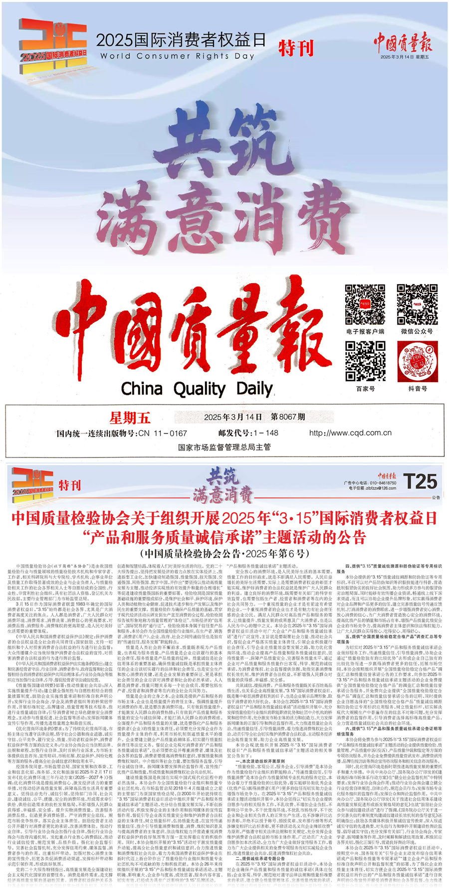 《中國消費(fèi)者報(bào)》(2025年3月15日刊)發(fā)布:中國質(zhì)量檢驗(yàn)協(xié)會關(guān)于組織開展2025年“3·15”國際消費(fèi)者權(quán)益日“產(chǎn)品和服務(wù)質(zhì)量誠信承諾”主題活動的公告(2025年第6號)