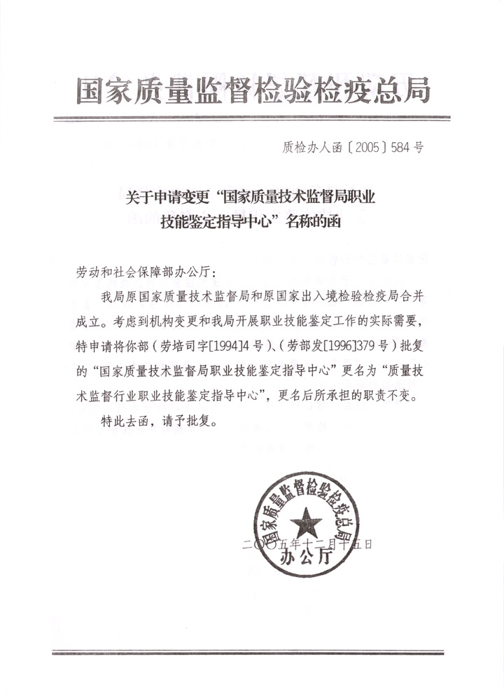 關(guān)于申請變更“國家質(zhì)量技術(shù)監(jiān)督局職業(yè)技能鑒定指導中心”名稱的函