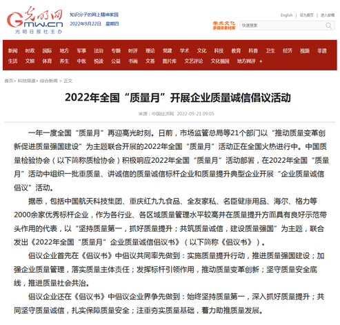 光明網(wǎng):2022年全國“質(zhì)量月”開展企業(yè)質(zhì)量誠信倡議活動(dòng)