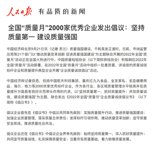 人民網(wǎng):全國“質(zhì)量月”2000家優(yōu)秀企業(yè)發(fā)出倡議:堅(jiān)持質(zhì)量第一 建設(shè)質(zhì)量強(qiáng)國