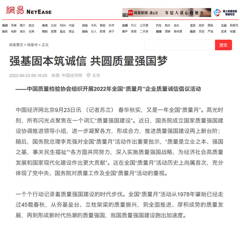 網(wǎng)易網(wǎng):強(qiáng)基固本筑誠信 共圓質(zhì)量強(qiáng)國夢——中國質(zhì)量檢驗(yàn)協(xié)會(huì)組織開展2022年全國“質(zhì)量月”企業(yè)質(zhì)量誠信倡議活動(dòng)