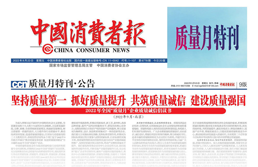 中國消費(fèi)者報(bào):堅(jiān)持質(zhì)量第一 抓好質(zhì)量提升 共筑質(zhì)量誠信 建設(shè)質(zhì)量強(qiáng)國