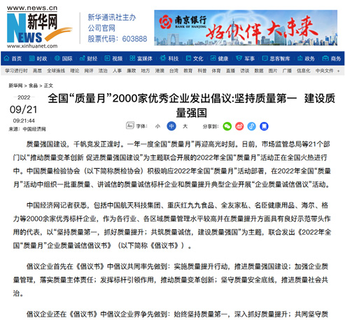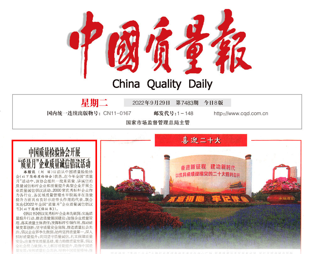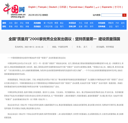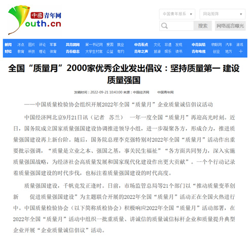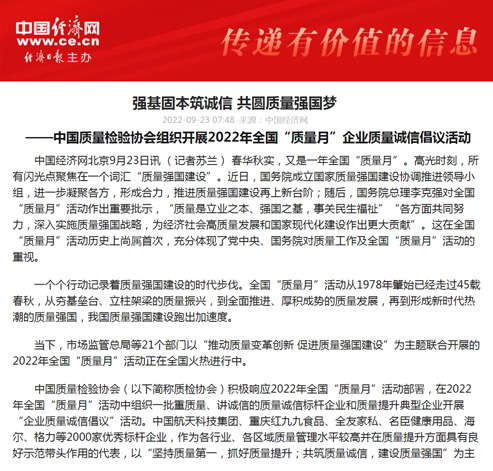 中國經(jīng)濟(jì)網(wǎng):匯聚力量攜手抓好質(zhì)量提升 肩負(fù)使命促進(jìn)質(zhì)量強(qiáng)國建設(shè)——2022年全國“質(zhì)量月”企業(yè)質(zhì)量誠信倡議活動(dòng)綜述
