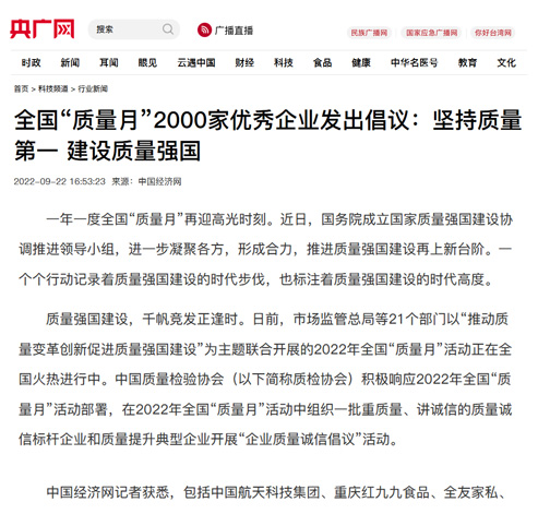 中央廣播電視總臺(tái)央廣網(wǎng):全國“質(zhì)量月”2000家優(yōu)秀企業(yè)發(fā)出倡議:堅(jiān)持質(zhì)量第一 建設(shè)質(zhì)量強(qiáng)國