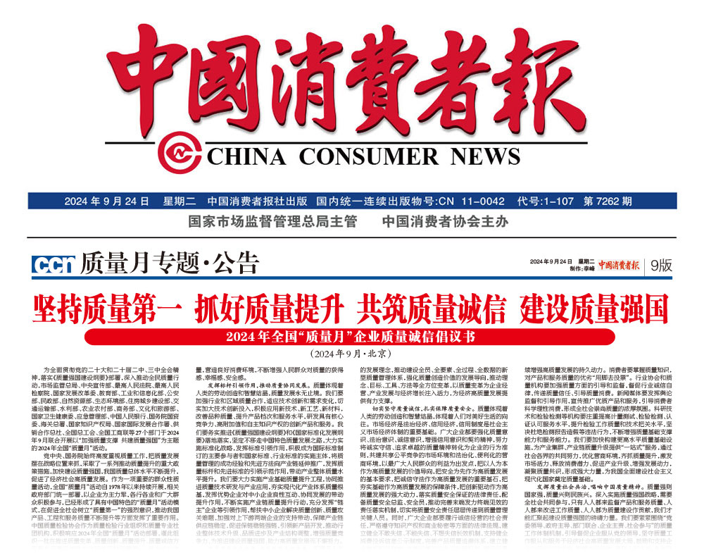 - 中國(guó)質(zhì)量報(bào)—堅(jiān)持質(zhì)量第一抓好質(zhì)量提升 共筑質(zhì)量誠(chéng)信 建設(shè)質(zhì)量強(qiáng)國(guó)——2024年全國(guó)“質(zhì)量月”企業(yè)質(zhì)量誠(chéng)信倡議書(shū)(2024年9月·北京)