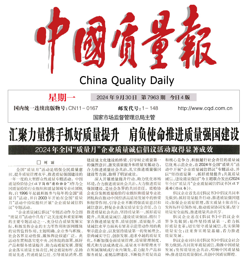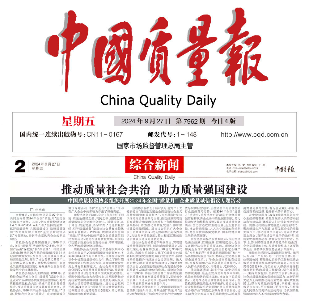 - 中國(guó)質(zhì)量報(bào)—堅(jiān)持質(zhì)量第一推動(dòng)質(zhì)量社會(huì)共治 助力質(zhì)量強(qiáng)國(guó)建設(shè)——中國(guó)質(zhì)量檢驗(yàn)協(xié)會(huì)組織開(kāi)展2024年全國(guó)“質(zhì)量月” 企業(yè)質(zhì)量誠(chéng)信倡議專(zhuān)題活動(dòng)
