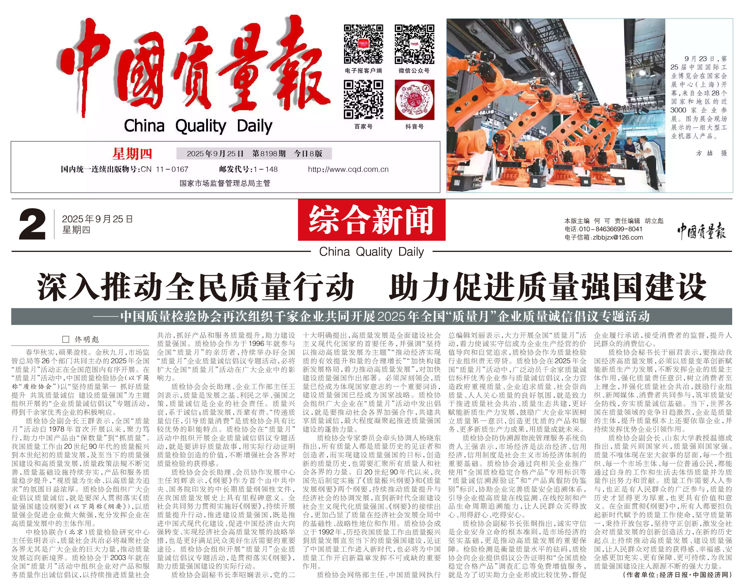 - 《中國質(zhì)量報(bào)》(2025年9月25日刊)發(fā)布:深入推動全民質(zhì)量行動 助力促進(jìn)質(zhì)量強(qiáng)國建設(shè)——中國質(zhì)量檢驗(yàn)協(xié)會再次組織千家企業(yè)共同開展2025年全國“質(zhì)量月”企業(yè)質(zhì)量誠信倡議專題活動